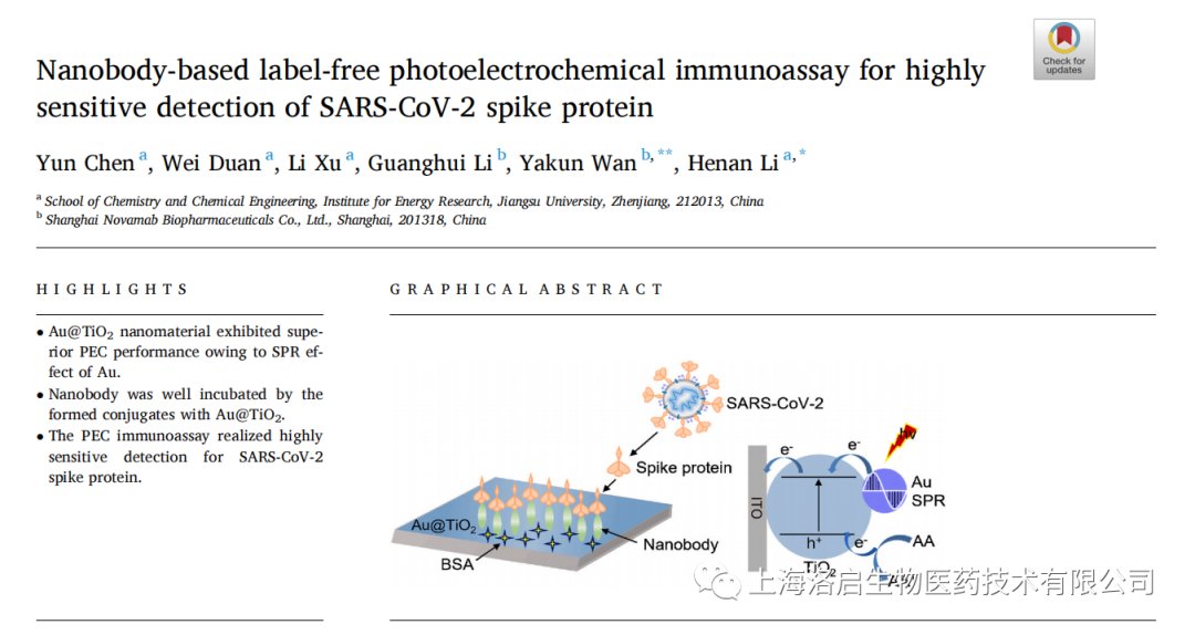 2022年5月3日,PA视讯官网生物和江苏大学化学化工学院李赫楠教授团队合作,在《Analytica Chimica Acta》发表了题为“Nanobody-based label-free photoelectrochemical immunoassay for highly sensitive detection of SARS-CoV-2 spike protein”的研究论文。PA视讯官网生物万亚坤博士和李贺楠教授为并列通讯作者,相关纳米抗体的知识产权归PA视讯官网生物所有。