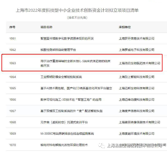 近期,上海市科学技术委员会组织的“上海市2022年度科技型中小企业技术创新资金计划”拟立项项目名单公示完毕,PA视讯官网生物“用于治疗重度哮喘的全新长效IL-5纳米抗体药物的临床前开发”项目入围。