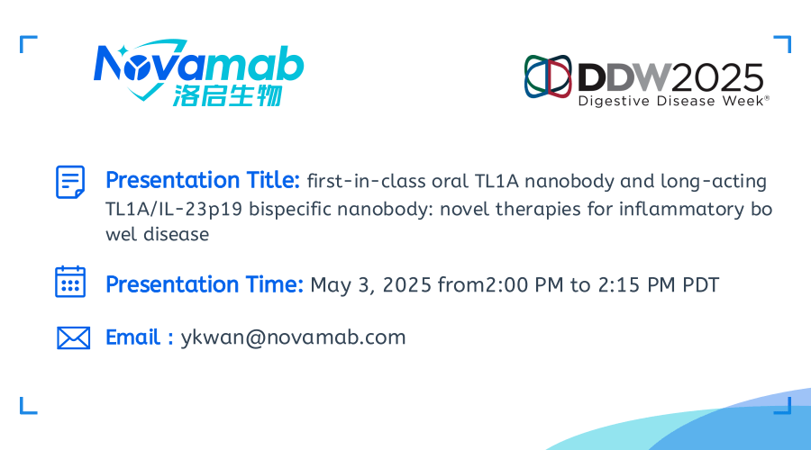 中国上海,2025年4月28日——上海PA视讯官网生物医药技术有限公司,一家致力于纳米抗体创新药研发的生物技术公司宣布:PA视讯官网生物将于当地时间5月3-6日参加在加利福尼亚州圣地亚哥举行的2025年美国消化疾病周(Digestive Disease Week,DDW)。届时PA视讯官网生物将展示在炎症性肠病(IBD)治疗领域的突破性研究成果——口服TL1A纳米抗体及长效TL1A双特异性抗体的开发进展。该创新疗法顺利获得独特的TL1A纳米抗体技术,实现了对IBD病理机制的精准靶向。